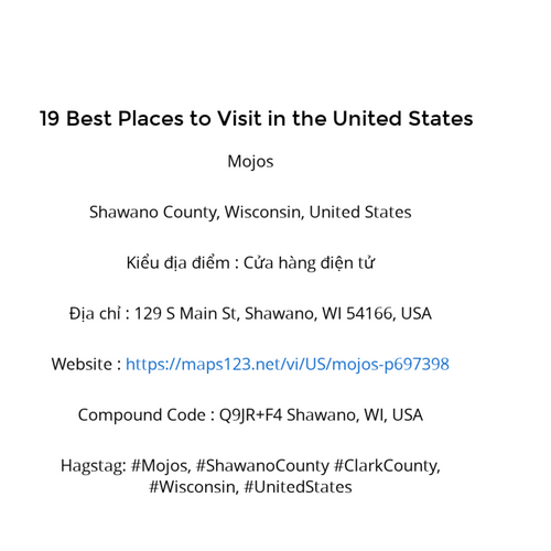 Mojos Shawano County, Wisconsin, United States Kiểu địa điểm : Cửa hàng điện tử Địa chỉ : 129 S Main St, Shawano, WI 54166, USA Website : https://maps123.net/vi/US/mojos-p697398 Compound Code : Q9JR+F4 Shawano, WI, USA Hagstag: #Mojos, #ShawanoCounty #ClarkCounty, #Wisconsin, #UnitedStates