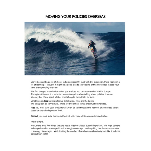 We’ve been adding a lot of clients in Europe recently. And with this expansion, there has been a lot of learning! I thought it might be a good idea to share some of this knowledge in case your sales are expanding overseas. The first thing to know is that unless you are lost, you can not mention MAP in Europe. Throughout Europe, it is verboten to mention price when talking about policies. I am no attorney but I have spent a lot of time talking to them that’s for sure.