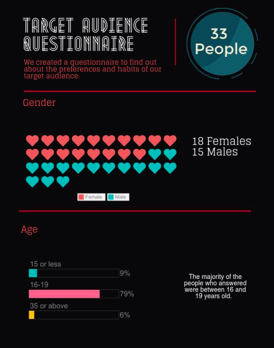 For our Target Audience Questionnaire we used the forms provided by Google. Doing so we could embed them on our blogs and gather the feedback more easily. Also this way we were able to share the form on Reddit and Facebook. The results of the questionnaire were presented in an engaging visual form using piktochart.com (an online info graphic maker)