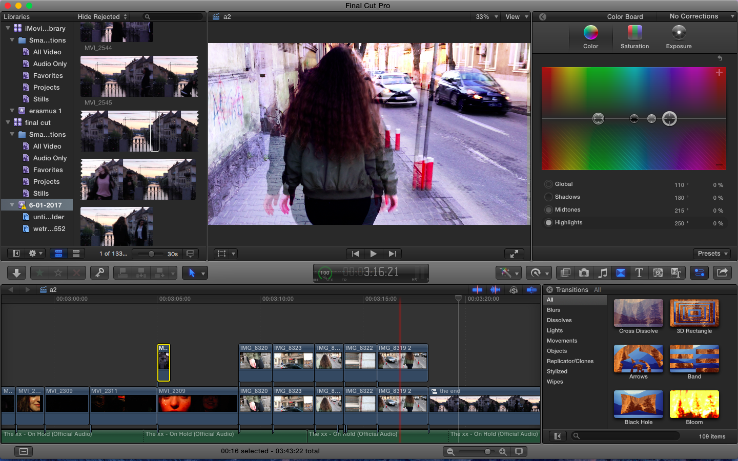 Most indie videos include certain type of shots: close up on the artists, performing - which is mostly used for promoting these independent (indie) artists. Long shots are used for establishing the narrative. There are also some handheld shots which engage with the audience from their own point of view. Not having a band, Georgia and I followed the narrative, breaking the shot convention. We supported The xx's style by adding series of conceptual aesthetic shots almost everywhere in our filming process. These shots fit in our music video because they belong to the indie genre and they are highly used by The xx in their official music videos. We supported their already created brand image by adding visually pleasing shots, full of contrast.