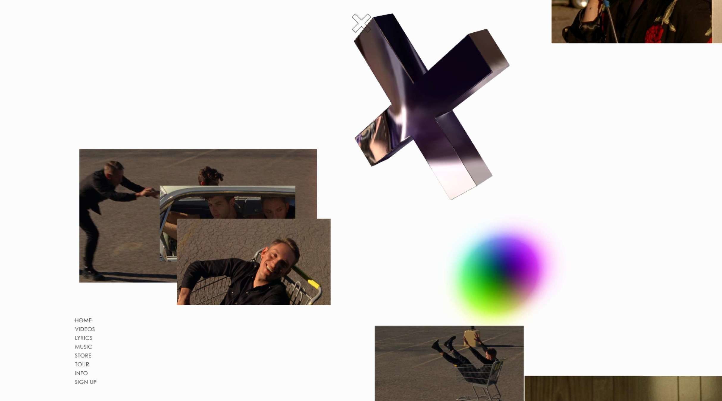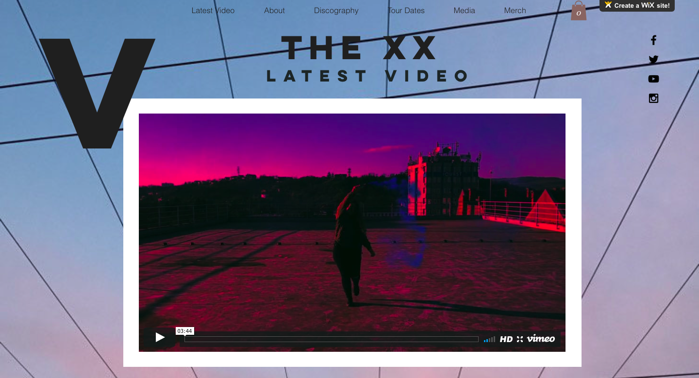 Our website follows a music band website conventions, including categories like About, Discography, Merch, Tours and Media. The amount of info from The xx's official website is quite restricted, following the indie minimalistic pattern, so we had to take some more information from their official social media as well as from Spotify. The website has one page, inspired from their official website, with anchor links attached to each category and a menu on top of the page. The social media links can be found on the right side of the page, with direct links to the band's official channels. The background image has the same colours as the bridge scene because it was taken exactly in that day, during filming. We tried out different fonts and we chose a style which would support our music video, would please us and would fit The xx’s style.