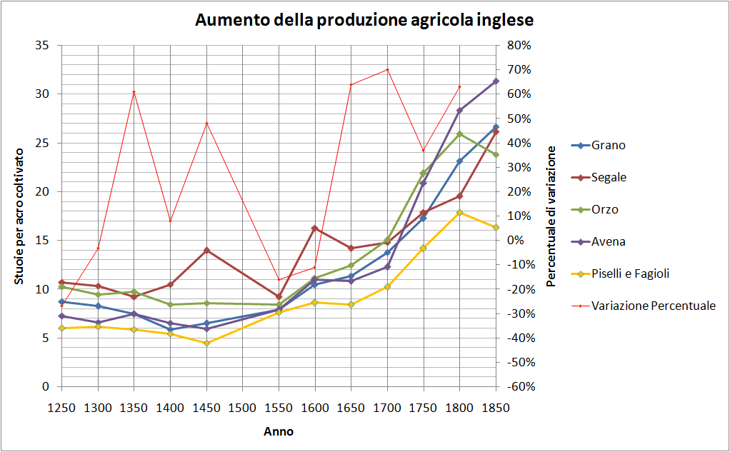 - A partire dal 1750 in Inghilterra si ha un incredibile aumento della produzione agricola, che permetterà di uscire dalla trappola malthusiana