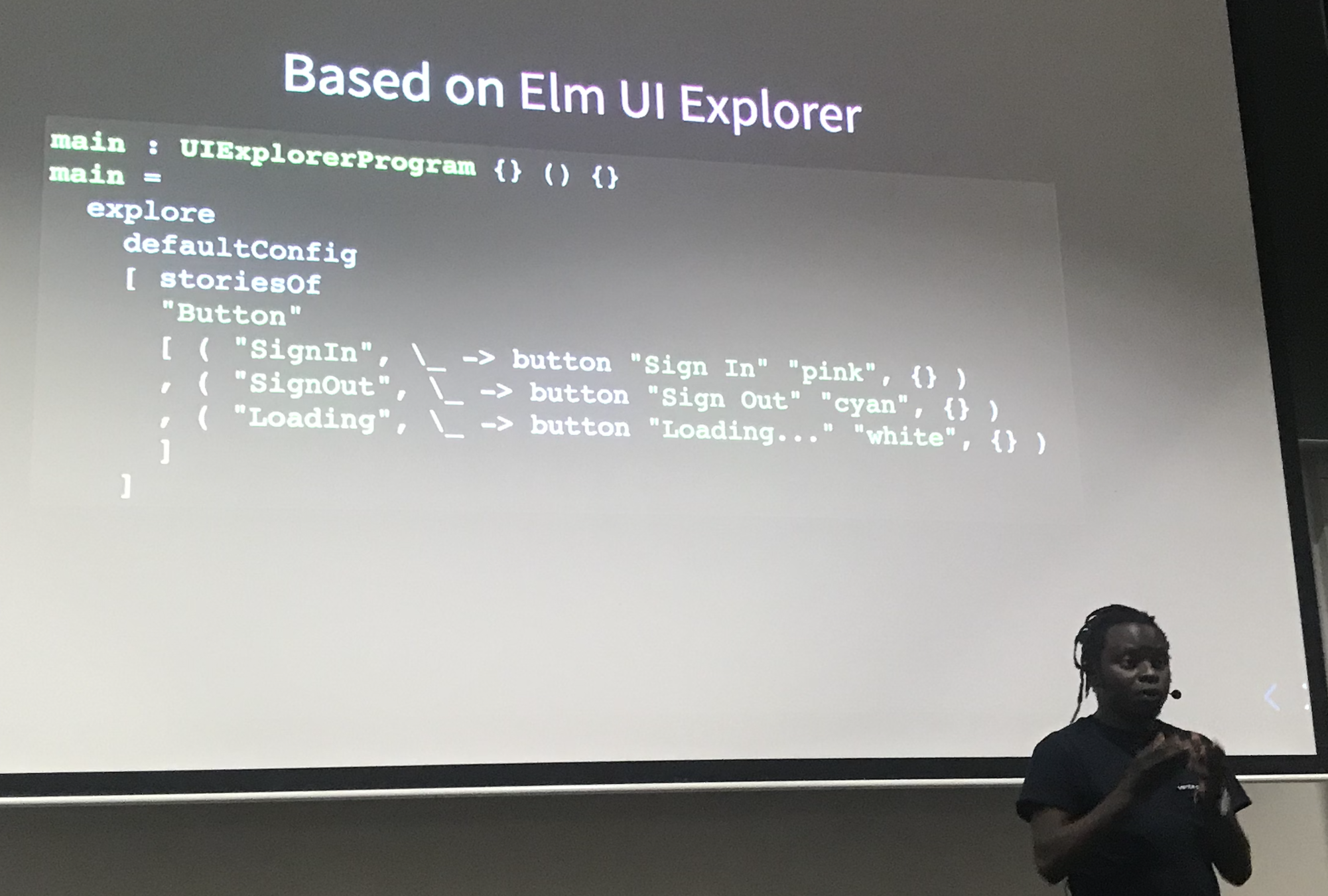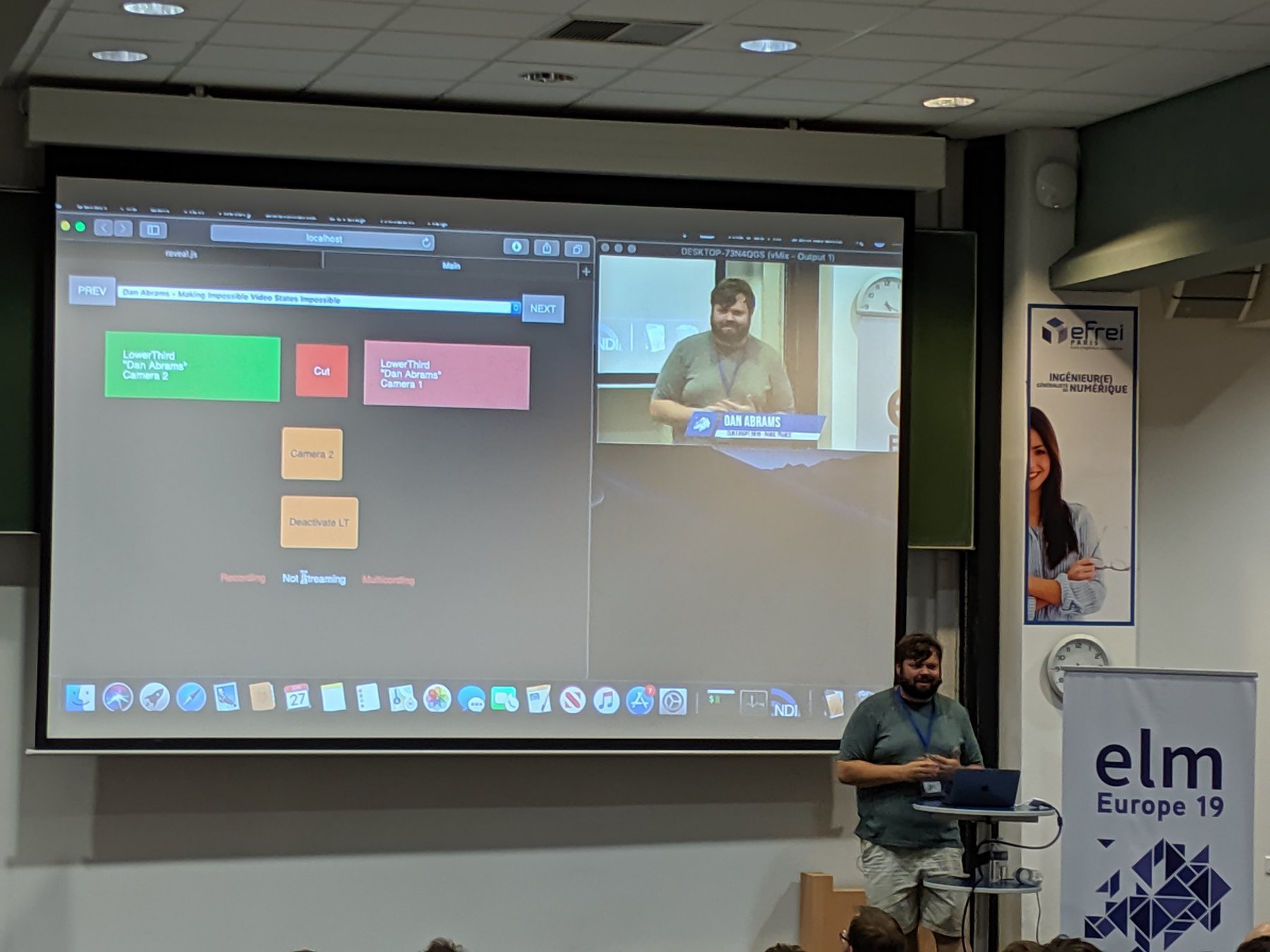 Live demo of the video software he made in Elm, which is, as he's giving the talk, being used to record him giving the talk.