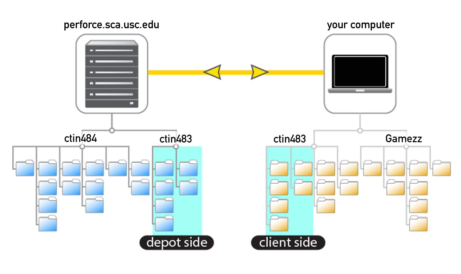 Perforce is a centralized system of version control – there's a central server (perforce.sca.usc.edu) where files live.