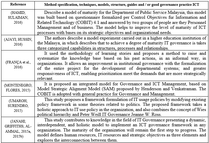 - An aspect to be noted is that most of the collected and selected articles were reports of use of the good practice ICT Governance known in academy and widely used in the Brazilian industry: COBIT, ITIL, CMMI.