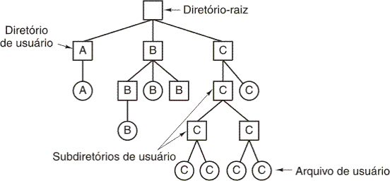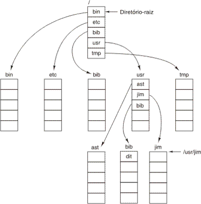 - Os diretórios são organizados hierarquicamente, fornecendo uma árvore no qual os elementos no interior da árvore são diretórios e os elementos nas folhas podem ser arquivos ou diretórios