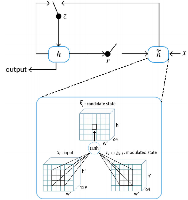 \tilde{h_t} = \tanh(x_t * w_{x\tilde{h}} + r_t \odot h_{t-1} * w_{h\tilde{h}} + b_{\tilde{h}})