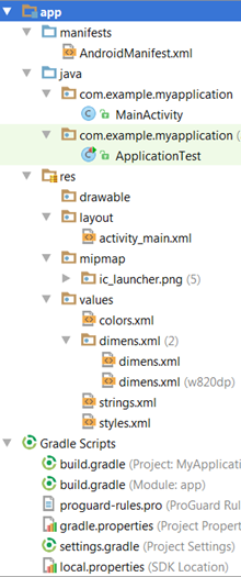 - layout: Contiene ficheros XML con vistas de la aplicación. Las vistas nos permitirán configurar las diferentes pantallas que compondrán la interfaz de usuario de la aplicación. Se utiliza un formato similar al HTML usado para diseñar páginas web.