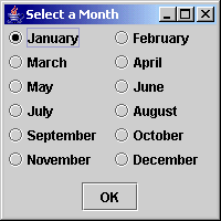 Dependen del tipo de diálogo y del tipo de opciones. Cuando se llama a showMessageDialog y showInputDialog, solo se obtiene un conjunto estándar de biblioteca (OK y OK/Cancelar, respectivamente). Cuando se llama showConfirmDialog, se puede optar entre 4 tipos de opciones: