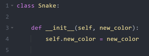 In the class named Snake, use the __init__() function to assign values for new_color