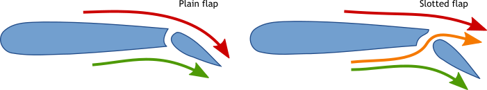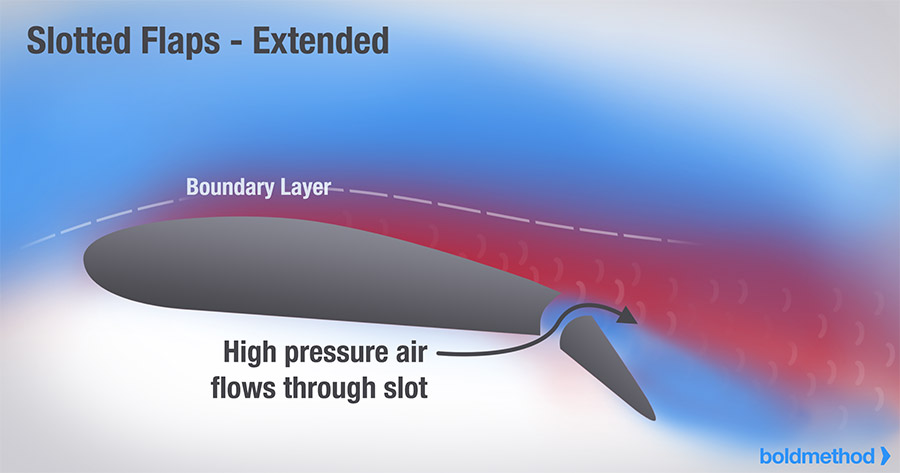 By opening a slot between the wing and the flap, high pressure air from the bottom of the wing flows through the slot into the upper surface. This adds energy to the wing's boundary layer, delays airflow separation, and produces less drag. The result? Lots of additional lift, without the excessive drag.