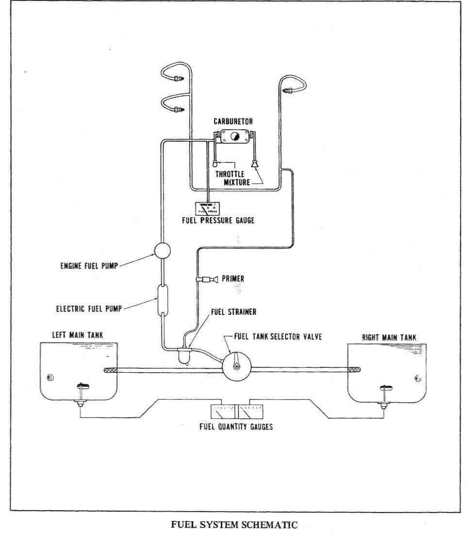 Flows: Main tanks ➡️ Fuel Selector ➡️ Electric Fuel Pump ➡️ Engine Fuel Pump ➡️ Carburetor
