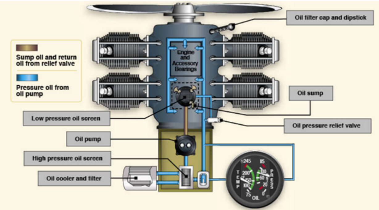 The engine oil system performs several important functions; Lubrication of the engine’s cooling parts, cooling of the engine by reducing friction, removing heat from the cylinders, providing a seal between the cylinder walls and pistons, and carrying away contaminants. The manufacture of the PA-28-151 aircraft requires a minimum of two quarts of oil and between 6-8 quarts as a normal operating range limit.