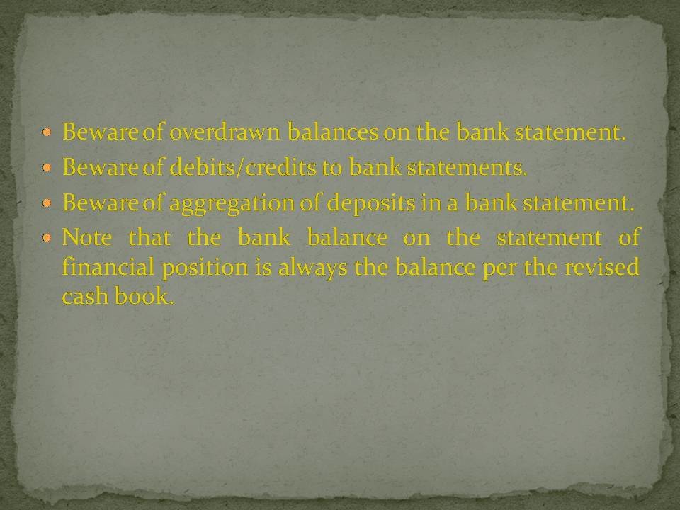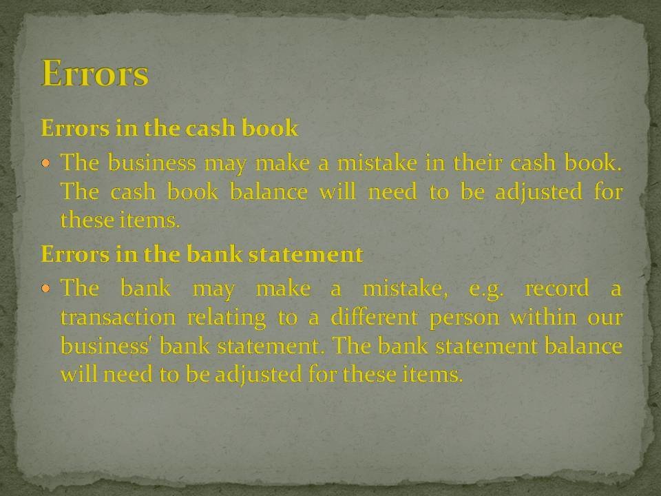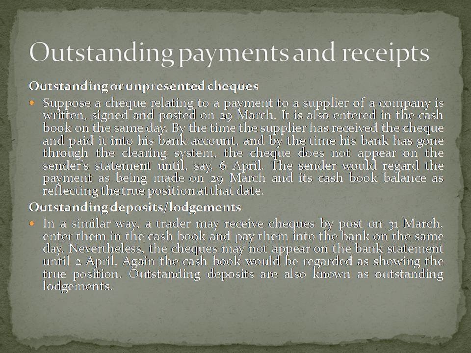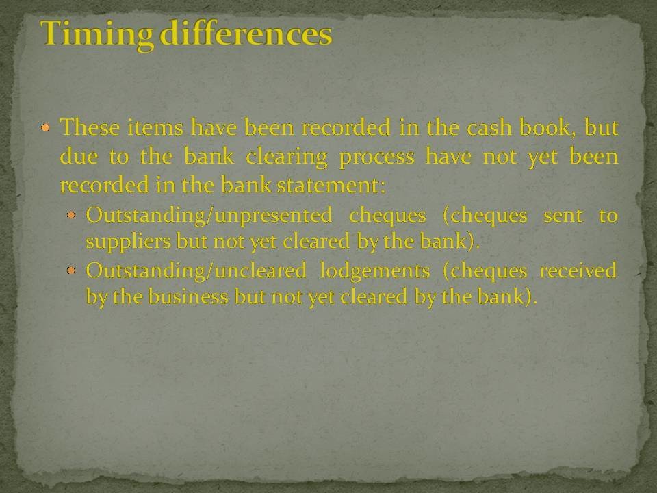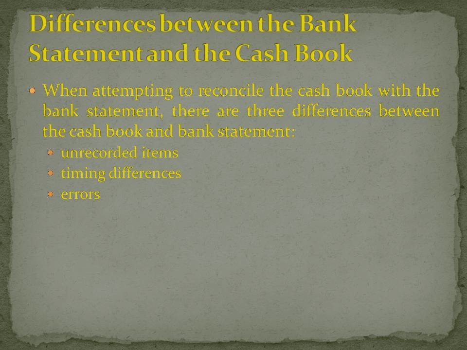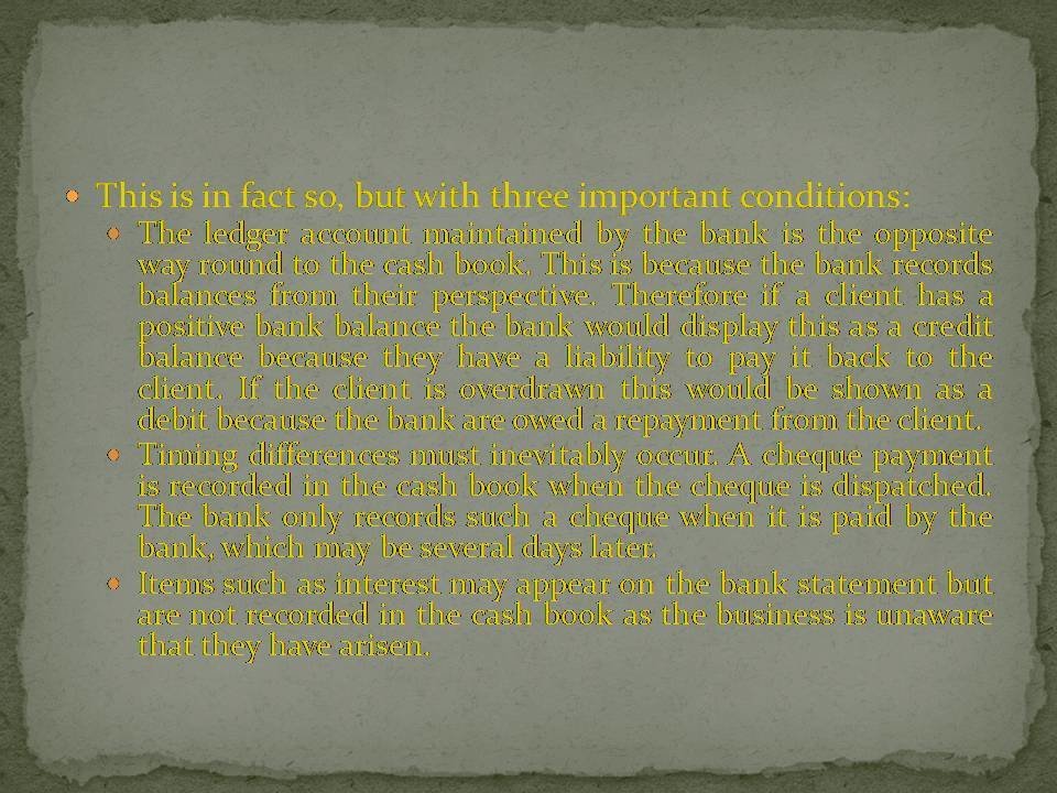The ledger account maintained by the bank is the opposite way round to the cash book. This is because the bank records balances from their perspective. Therefore if a client has a positive bank balance the bank would display this as a credit balance because they have a liability to pay it back to the client. If the client is overdrawn this would be shown as a debit because the bank are owed a repayment from the client.
