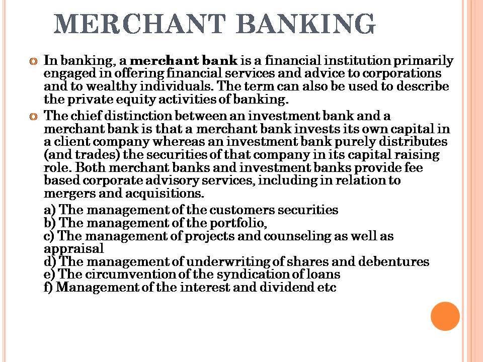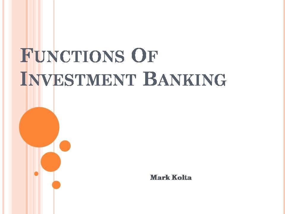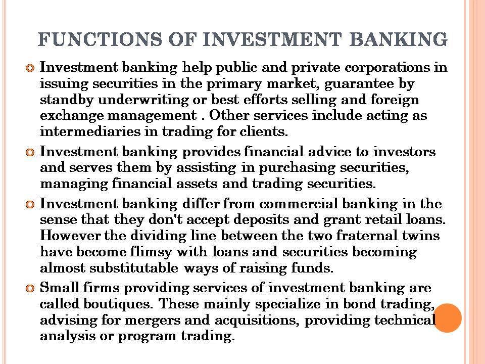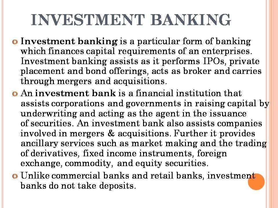 Investment banking is a particular form of banking which finances capital requirements of an enterprises. Investment banking assists as it performs IPOs, private placement and bond offerings, acts as broker and carries through mergers and acquisitions.