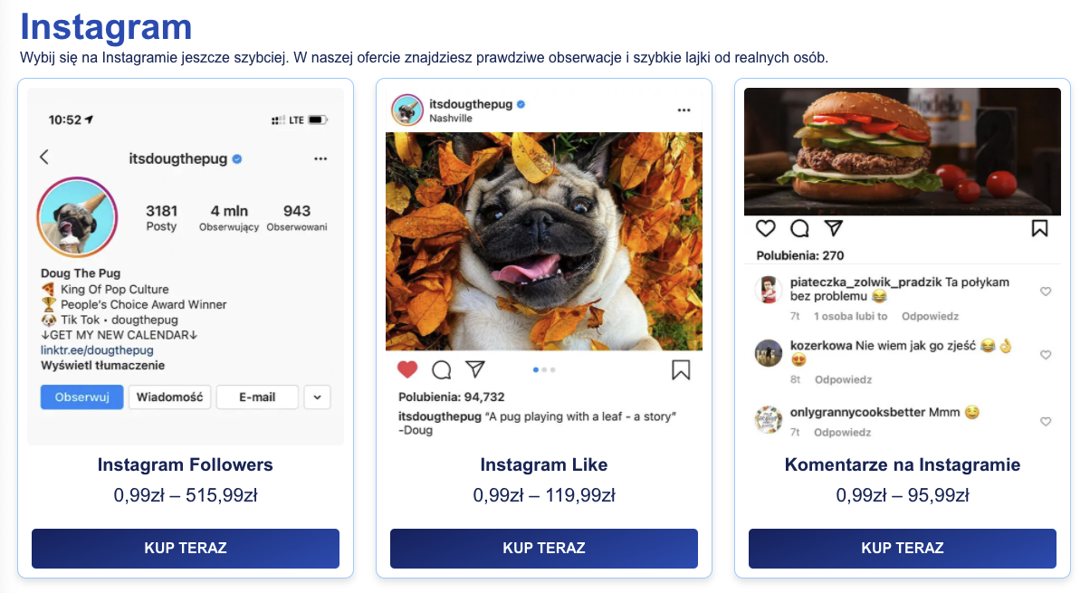 Wypromowani to jeden z najstarszych serwisów typu kup follow w Polsce. Serwis oprócz usług promocyjnych na Instagramie znany jest z promowania kont na Facebooku, YouTube, TikTok a nawet Google.