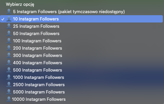 Ppierwszy wybór, którego musisz dokonać przy kupowaniu followersów na Instagramie to ilość. Dostaniesz dokładnie tyle obserwujących ile zaznaczysz, więc dobrze przemyśl tę decyzję żeby nie musieć składać kilku zamówień. Możesz wybrać ilość od 5 do nawet 10 tysięcy Instagram followers. Każda ilość zostanie dodana w bezpieczny i wiarygodny sposób dlatego śmiało zaznacz dokładnie tyle ile potrzebujesz.