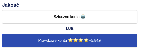 Jakość to wybór pomiędzy sztucznymi a prawdziwymi kontami. Dzięki wybraniu tej opcji możesz wskazać, na czym najbardziej Ci zależy. Serwis rekomenduje wybór prawdziwych kont dla najlepszych efektów kampanii jednak jeżeli nie masz wystarczającego budżetu, możesz znacznie obniżyć cenę zamówienia wybierając sztuczne konta. Decyzja należy do Ciebie.