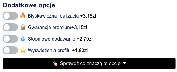 Wybór dodatkowych opcji jest opcjonalny czyli niewymagany, ale pozwala na jeszcze lepsze dostawanie zamówienia do naszych potrzeb. Dzięki nim określisz szybkość realizacji zamówienia, dodasz rozszerzoną gwarancję do zamówienia lub wyświetlenia profilu co może zagwarantować dużo lepsze efekty z nabijania followers na Instagramie.