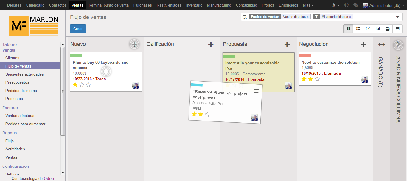 Si necesitas gestionar las relaciones de ventas con los clientes, Odoo ERP te hace el trabajo más fácil con el módulo gratis CRM, permitiendo que puedas descubrir las oportunidades, llevar un control de los pasos en los que se encuentra la venta, saber el trabajo de los vendedores,