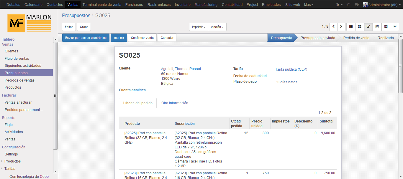 El módulo de ventas gestiona los presupuestos, los pedidos, las ventas además se puede vincular con el módulo de producción.