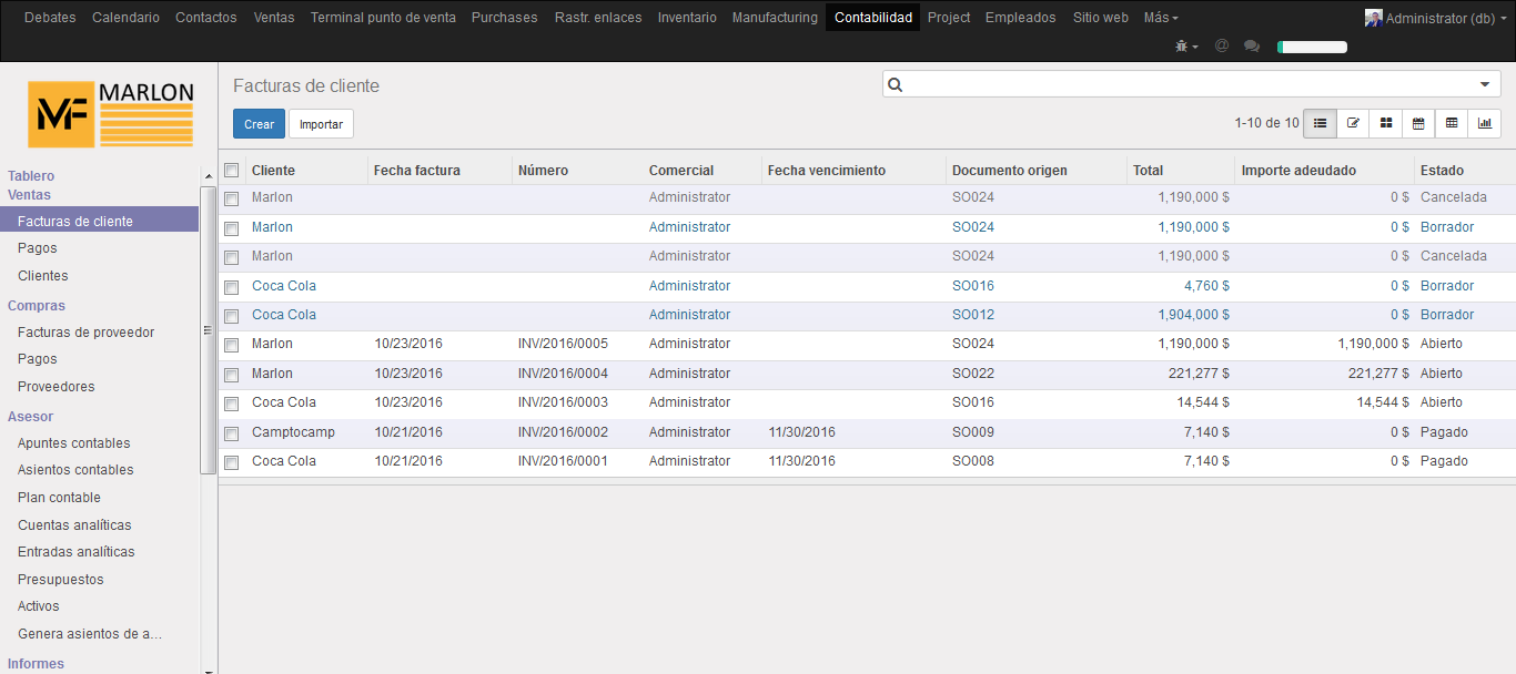 El módulo de contabilidad lleva el control del libro mayor, cuentas contables, gastos, asientos contables, los activos, diferentes tipos de monedas y los informes contables. También se puede implementar con módulos desarrollados a medida la facturación electrónica con SII en Chile.