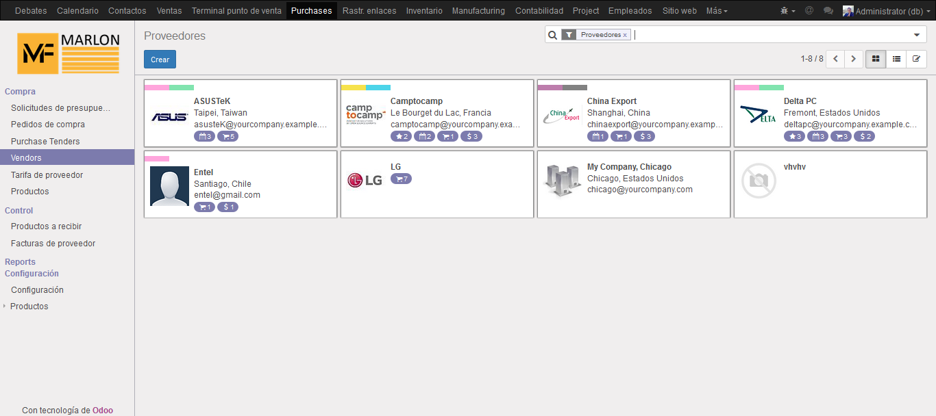 El módulo de compras gestiona todo el proceso de compra de la empresa, desde el presupuesto hasta la entrada de mercancía al inventario. Se puede comprar con diferentes monedas.