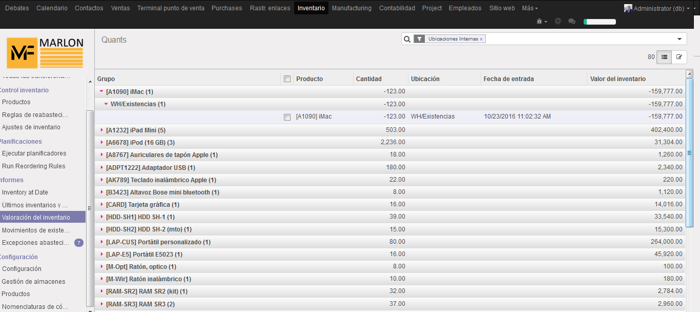 Módulo de Inventario Odoo gestiona fácilmente los almacenes, las ubicaciones, los controles de inventario y con reportes muy dinámicos permite exportar a excel los resultados para poder tomar decisiones.