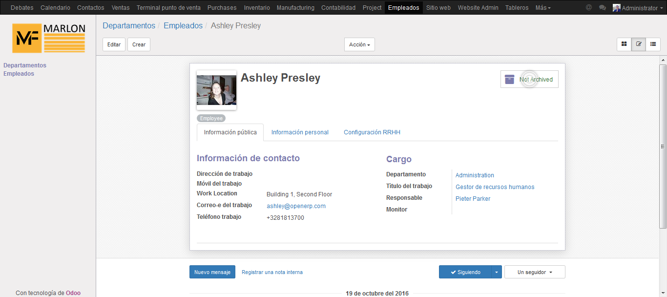 El módulo de Recursos humanos permite llevar el control de los trabajadores, controlar las ausencias, las reglas salariales, el perfil del empleado con todos sus datos y el proceso de Nómina.