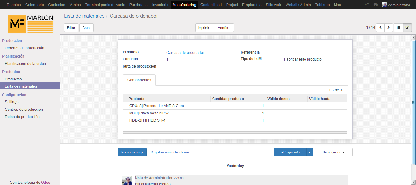 Este módulo permite ejecutar la planificación en una empresa con la utilización de formulación de materiales, compras bajo pedido, gestión de órdenes de producción, gestión de diferentes zonas de producción y controlar las rutas de producción.