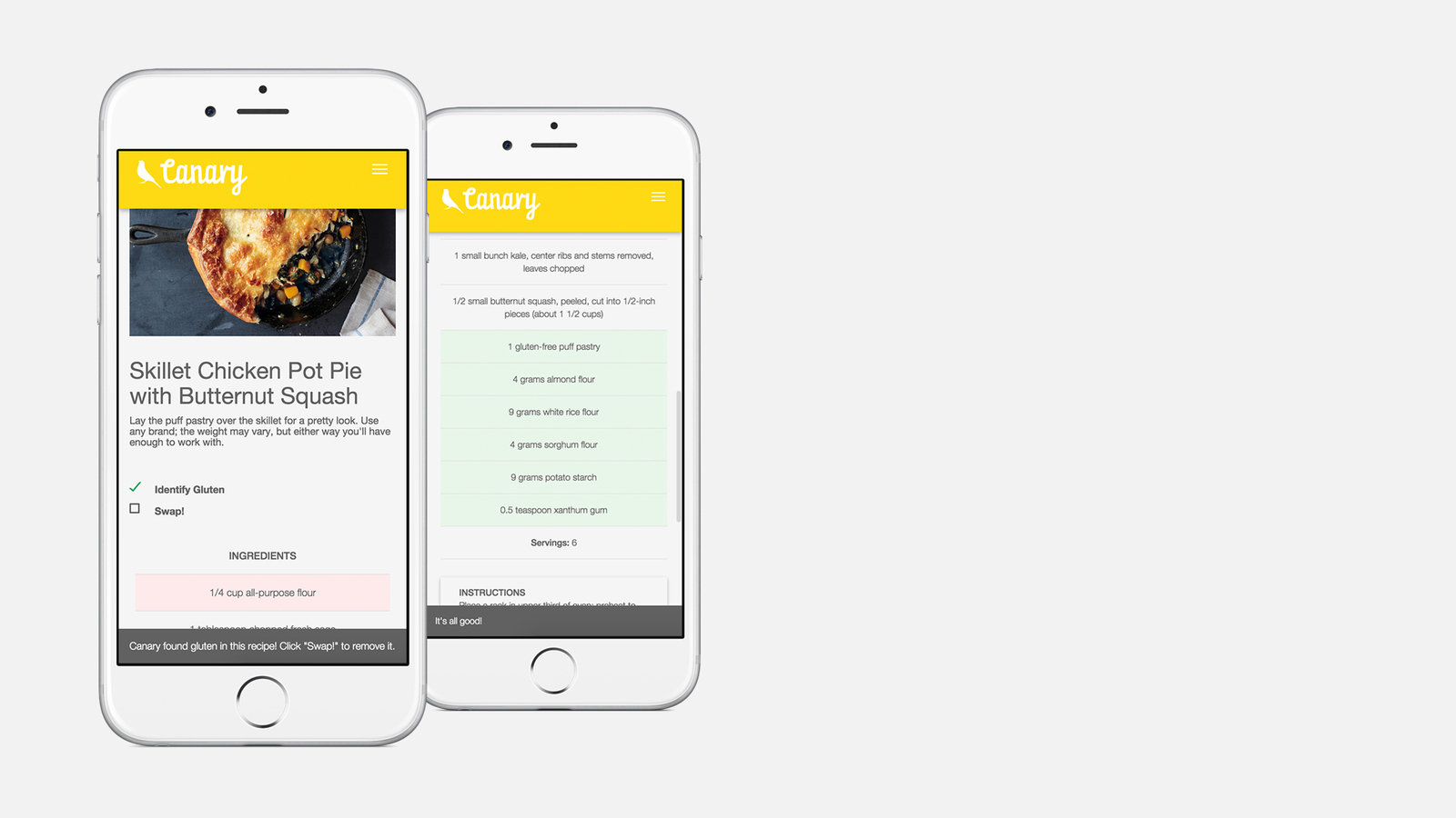 Canary identifies gluten-containing ingredients, and swaps them for alternatives that optimize taste and texture. Flour is mapped to categories related to density, protein, fat, lightness, and stickiness, among other qualities. Other items are mapped to a sensible substitution.