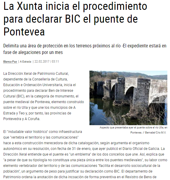 (DOG, 16 mayo 2016): El patrimonio cultural de Galicia está constituido por los bienes muebles, inmuebles o manifestaciones inmateriales que, por su valor artístico, histórico, arquitectónico, arqueológico, paleontológico, etnológico, antropológico, industrial, científico y técnico, documental o bibliográfico , deban ser considerados como de interés para la permanencia, reconocimiento e identidad de la cultura gallega a través del tiempo.
