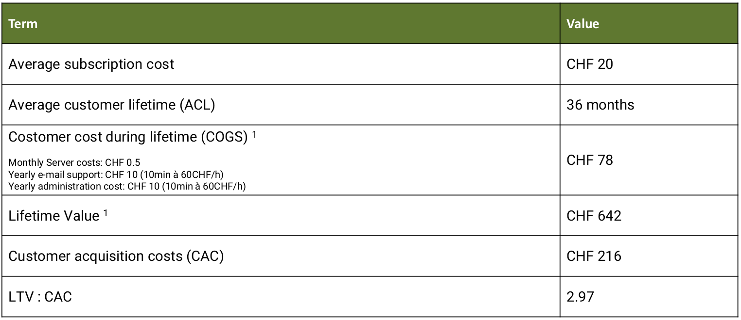 1: Lifetime Value = Avg. Subscription cost * ACL – COGS