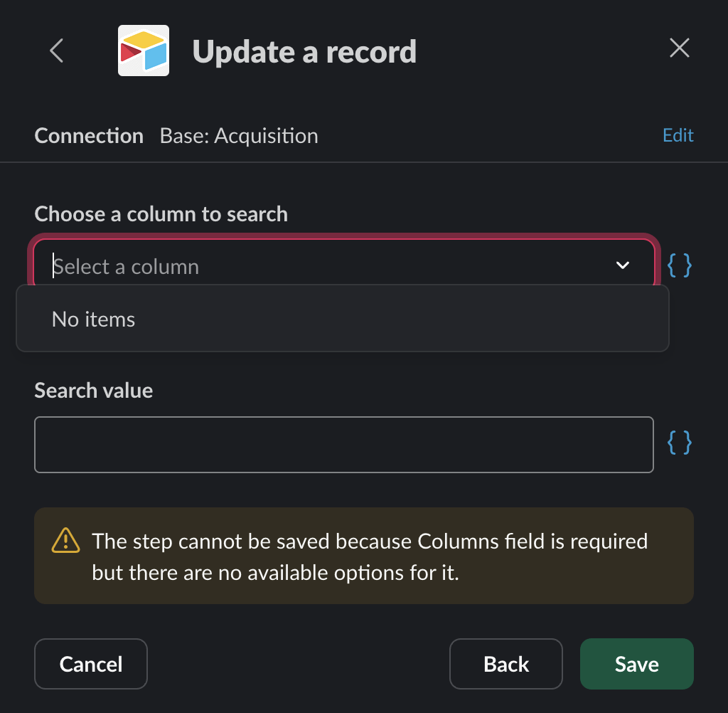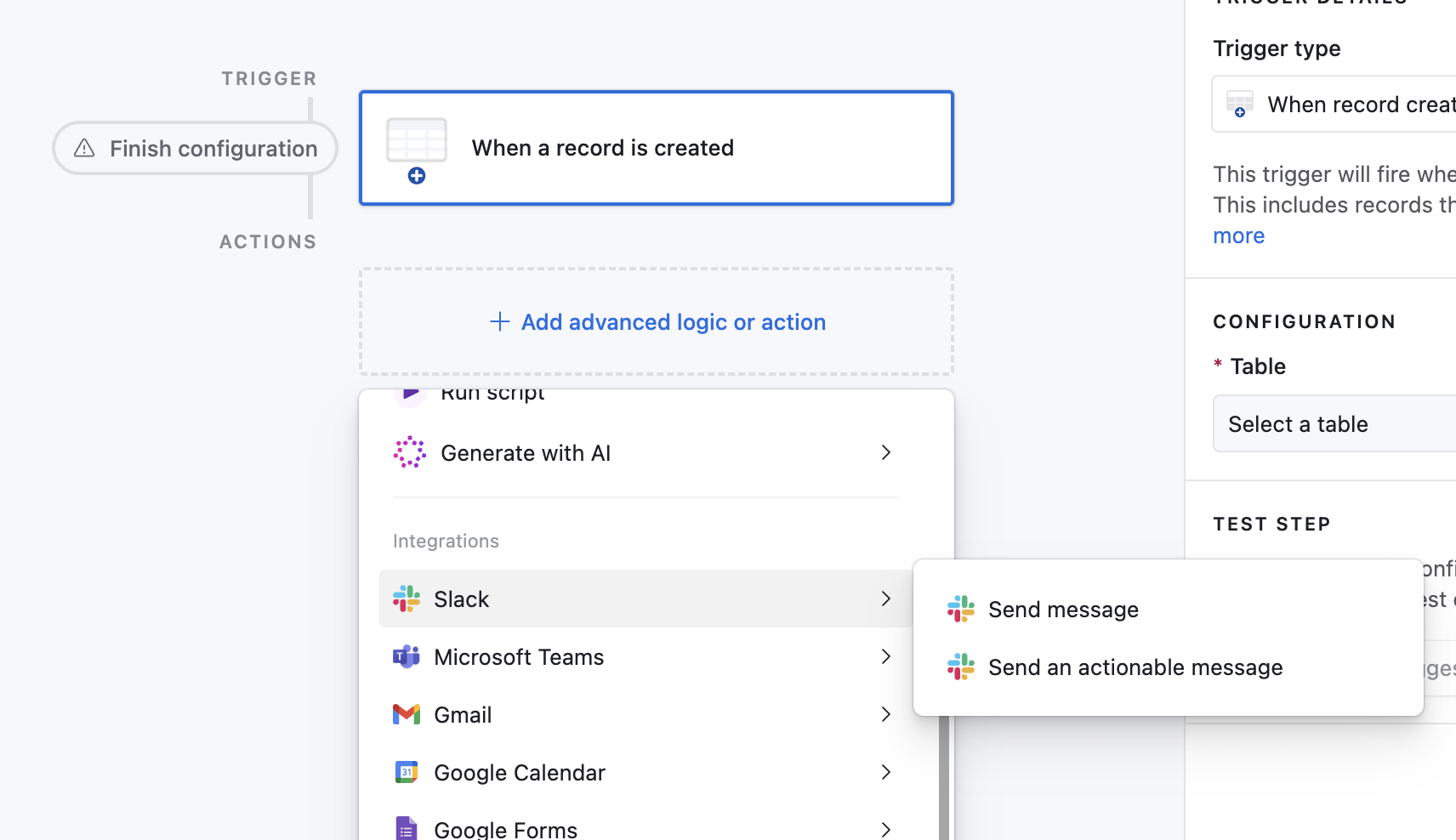 But then, the actions are limited. No generic outgoing webhooks, no zapier, make, n8n action. Airtable actions are basic (and it does not load fields for me)