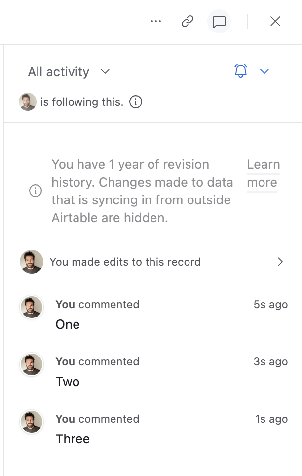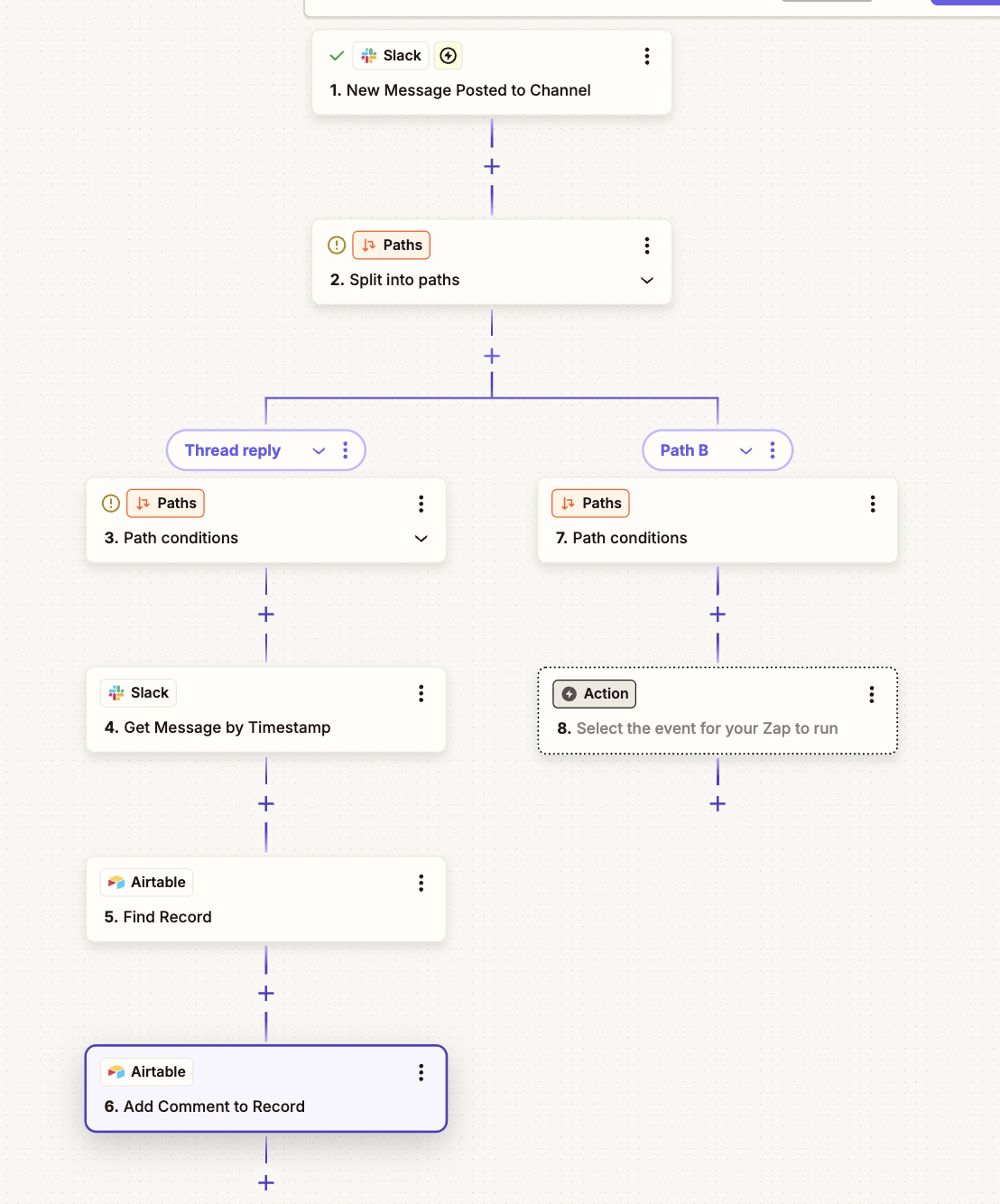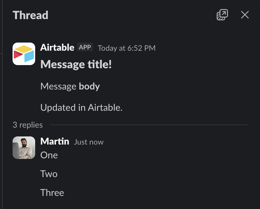 We can react to message, check if it's thread reply, find parent message, find airtable record, add comment.