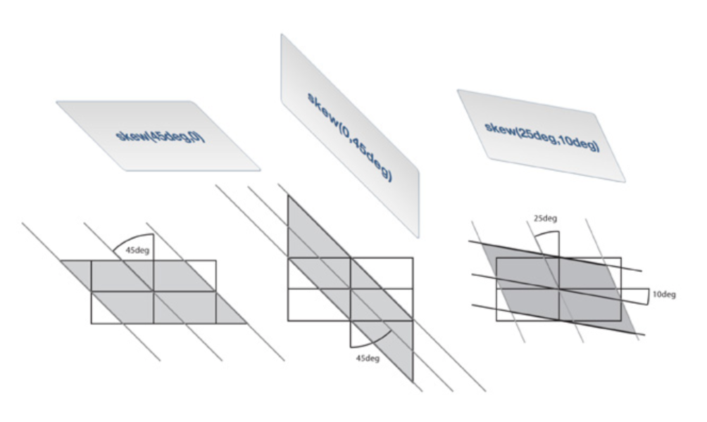 transform: skew(45deg,0deg) scale(.5) translate(400px,500px) rotate(90deg);CSS ypatybė transform, nurodant reikšmę leidžia naudoti kelias funkcijas.