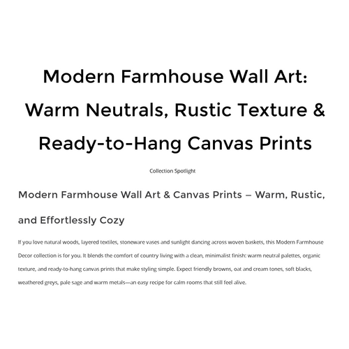 Shop Modern Farmhouse wall art: warm neutrals, rustic texture, ready-to-hang canvas prints. Styling tips, size calculator, gifting ideas, and FAQs inside.