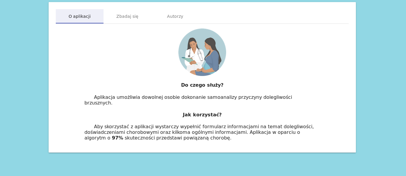 - Zasadniczą funkcją aplikacji jest umożliwienie pacjentowi dokonania diagnozy bólu brzucha poprzez wypełnienie formularza wykorzystując nauczony model (MLP).