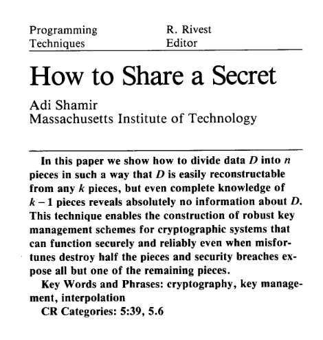 Dado un secreto S (numero entero) se quiere dividir el secreto en S1,...,Sn en piezas de información que juntas permitan reconstruir el secreto S