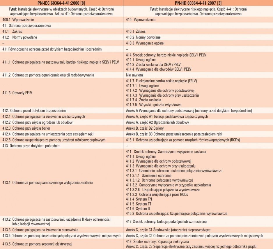Normy IEC 60364-4-41 oraz PN-HD 60364-4-41 zawierają następujące działy i aneksy: