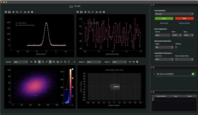 Hardware control is delegated to Ophyd (Bluesky project), mostly through