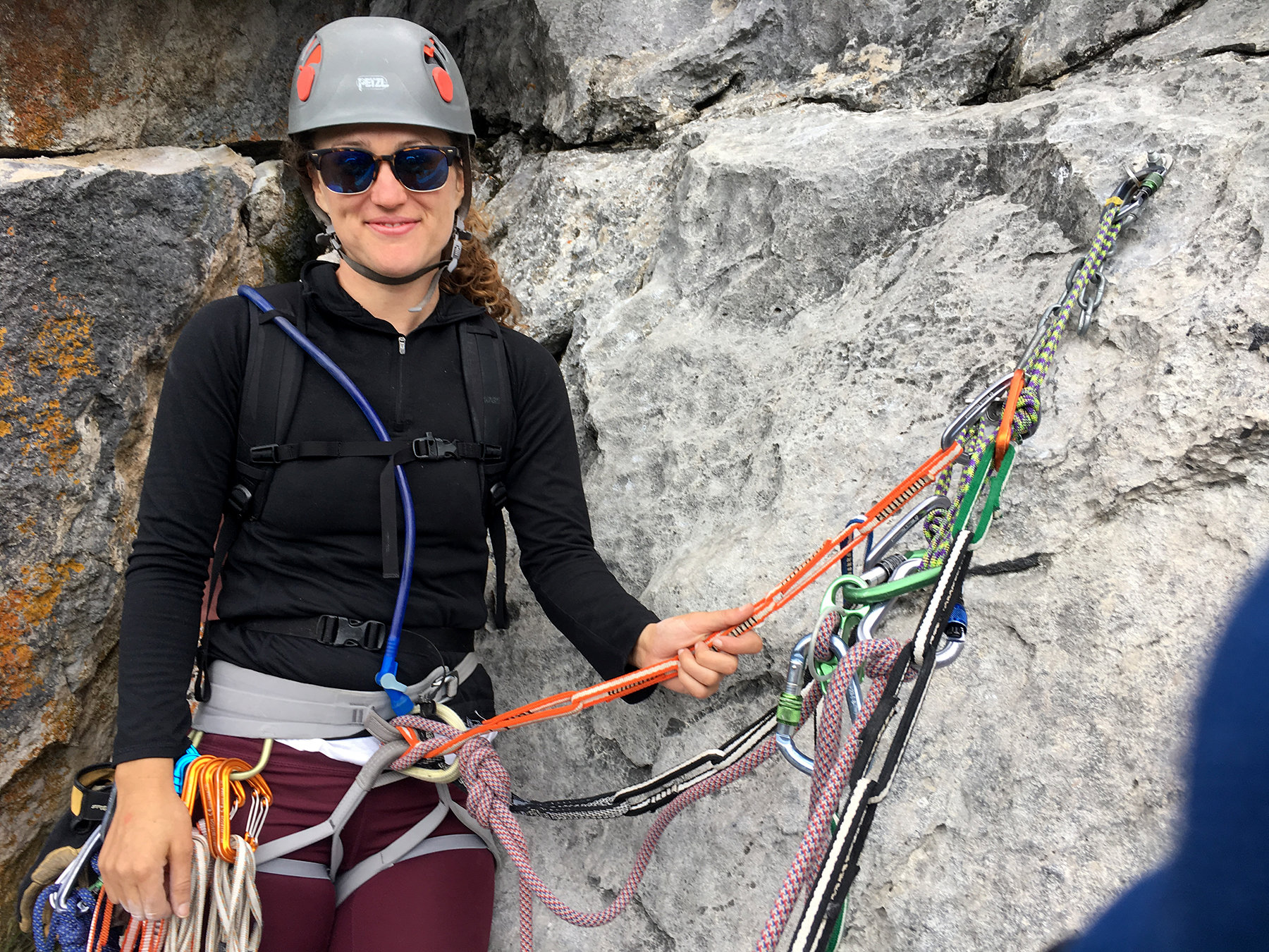 Climbing vertical faces that have no bolts or pre-rigged protection, requiring the climber to place temporary protection with gear like cams or nuts/stoppers that are wedged into cracks, and will protect a climber if they fall, but can be removed after the climb.