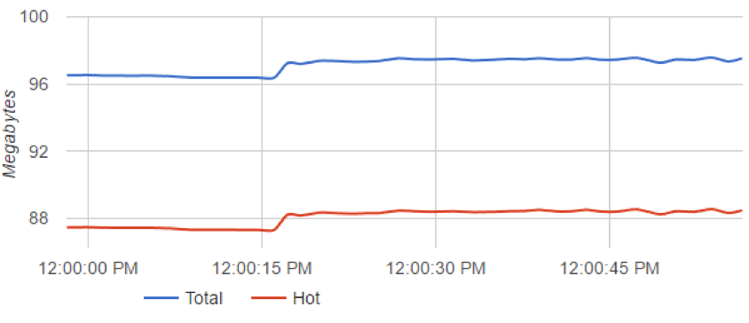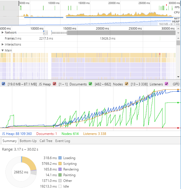 1 of the 30 client performance captures. While fps is high (criteria 1), heap size is growing as the number of events are logged. Also there are many network requests that eventually stack up and queue)