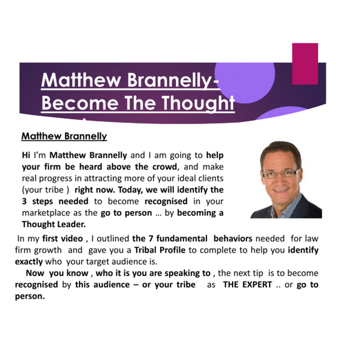 Hi I’m Matthew Brannelly and I am going to help your firm be heard above the crowd, and make real progress in attracting more of your ideal clients (your tribe ) right now. Today, we will identify the 3 steps needed to become recognised in your marketplace as the go to person … by becoming a Thought Leader.