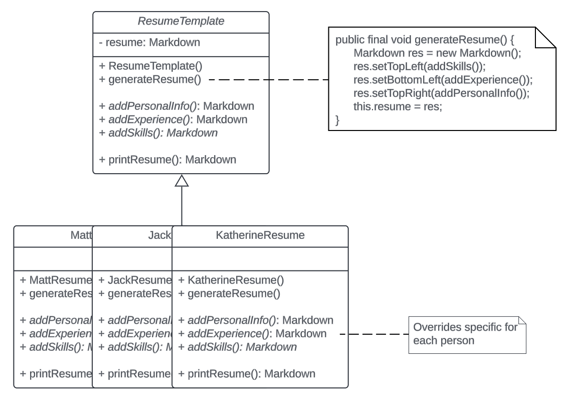 generateResumeis the template method that can be split into smaller "steps" - Steps can be overridden by subclasses and they are the hook methods