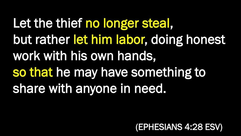 28 He who steals must steal no longer; but rather he must labor, performing with his own hands what is good, so that he will have something to share with one who has need.