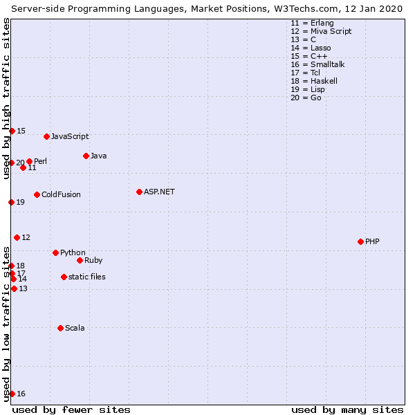 Una de las razones por las que prácticamente todos los sitios web usan PHP es porque WordPress usa PHP. La cuota de mercado de WordPress es aproximadamente el 35% de todos los sitios web. Prácticamente 75 millones de sitios utilizan WordPress en la actualidad.