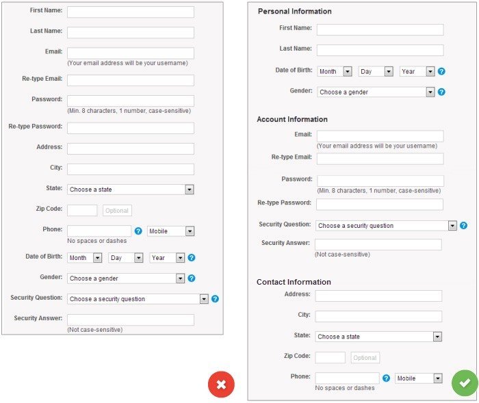 Los formularios nunca deberían consistir en más de una columna. El principal problema con los forms de multiples columnas, es que los Usuarios interpretan los campos de manera inconsistente. Si los campos aparecen de manera adyacente sobre el eje horizontal, el usuario debe escanearlos en forma de Z, alentando la velocidad de comprensión y “embarrando” el camino al completarlo. Pero si el formulario se encuentra en una sola linea, el camino es directo hacia el final de la página.