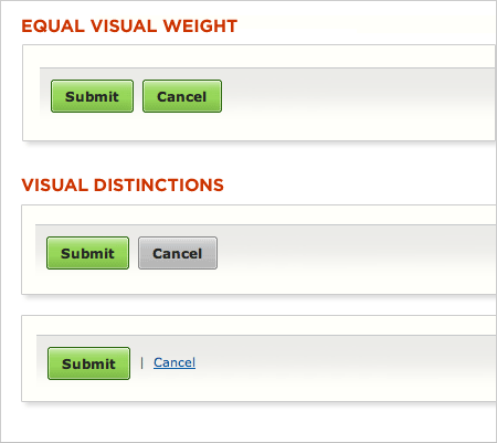 Una diferenciación poco clara entre una acción primaria y una secundaria fácilmente lleva al usuario a cometer errores. Reduciendo la prominencia visual de las acciones secundarias minimiza el riesgo de errores potenciales y guía a nuestros usuarios envíos exitosos.