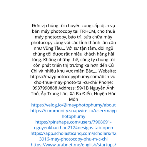 Website: https://mayphotocopyphumy.com/dich-vu-cho-thue-may-photo-tai-cu-chi/ Đơn vị chúng tôi chuyên cung cấp dịch vụ cung cấp máy photocopy tại TP.HCM, hình thức cho thuê máy photocopy, bảo trì, sửa chữa máy photocopy cùng với các khu vực lân cận n
